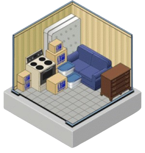 Holds furnishings of a one bedroom apartment, including some major appliances.